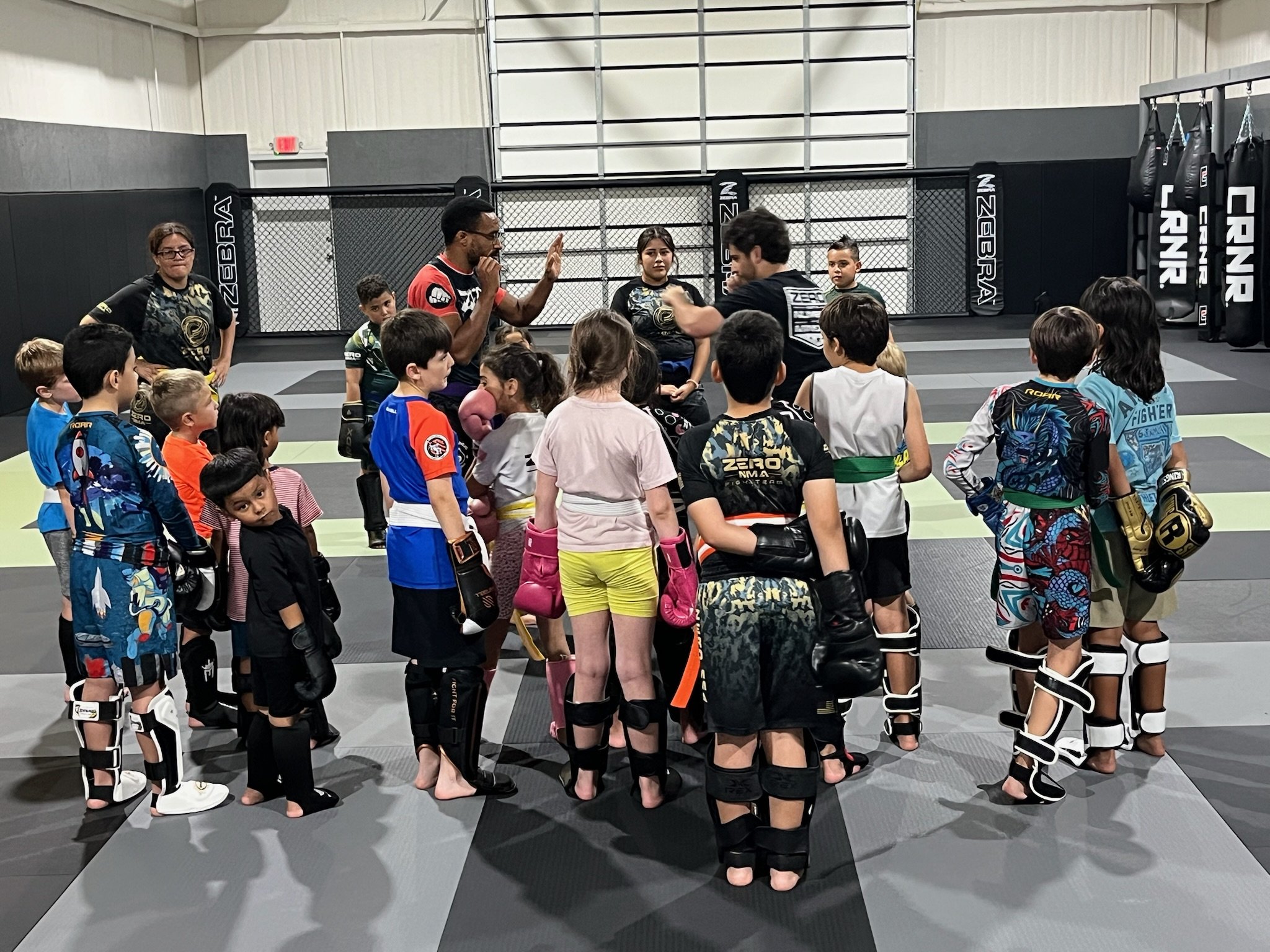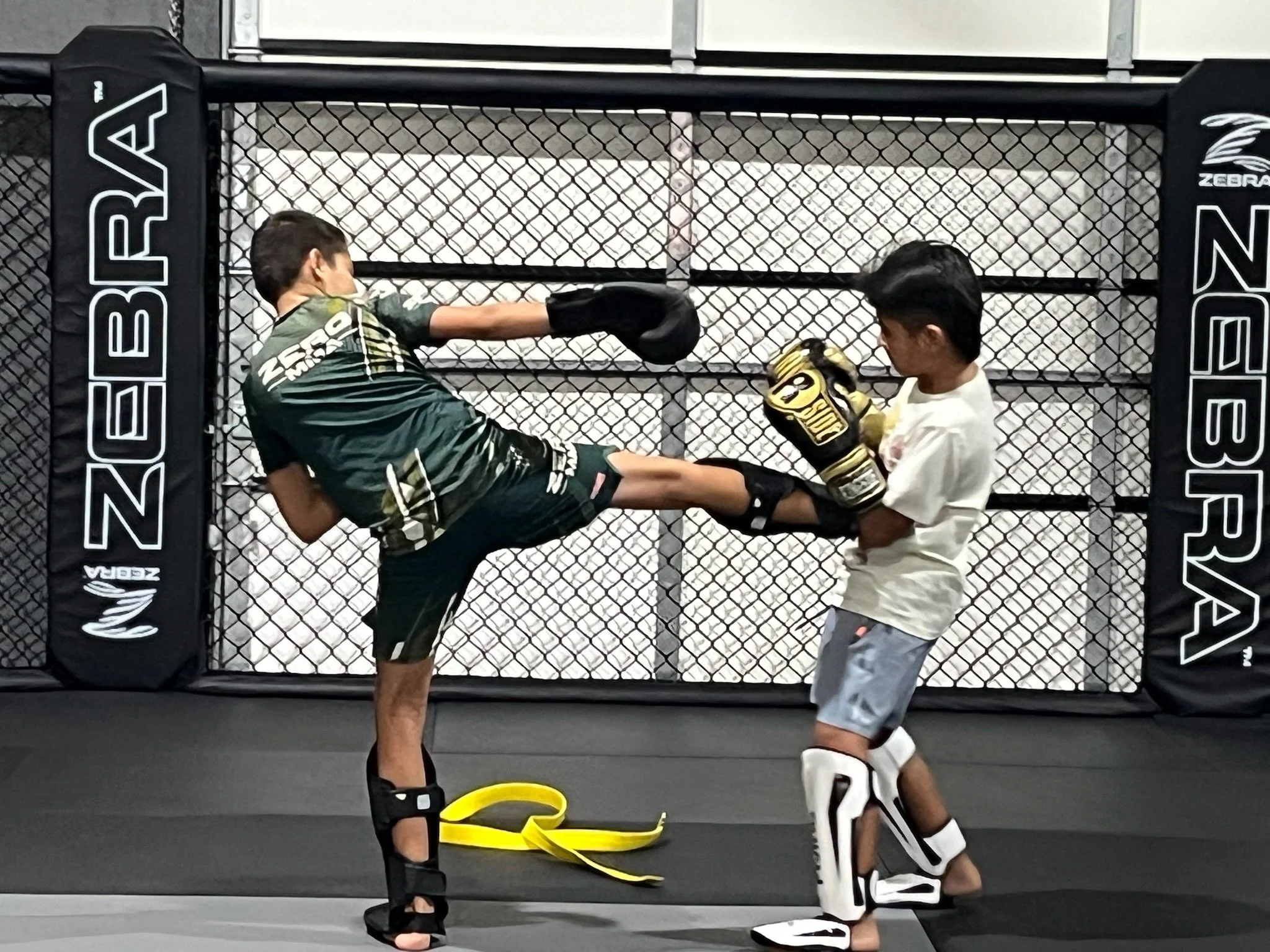 Our Kids MMA Program is open to Mighty Zeros (ages 5–7) and Major Zeros (ages 8–13) and blends Brazilian Jiu-Jitsu, wrestling, and kickboxing into a well-rounded mixed martial arts curriculum. Training focuses on safe, age-appropriate MMA fundamentals, teaching kids how to connect striking, takedowns, and ground control with confidence and control.